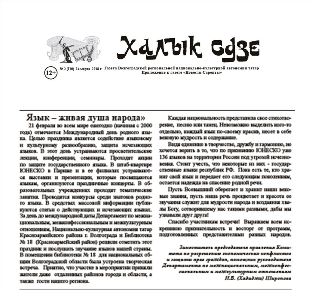 Мы - Департамент по межнациональным, межконфессиональным и межкультурным отношениям Всероссийского комитета по разрешению экономических конфликтов и защите прав граждан, Национально-культурная автономия татар Красноармейского района г.Волгограда и Библиотека №18 (Красноармейский район г.Волгограда).