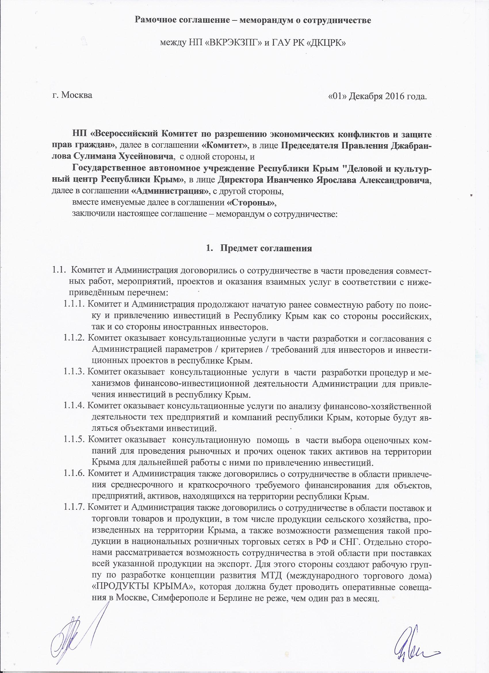 1 декабря 2016 года НП «Всероссийский Комитет по разрешению экономических конфликтов и защите прав граждан» и Государственным автономным учреждением Республики Крым «Деловой и культурный центр Республики Крым» заключили соглашение – меморандум о сотрудничестве: